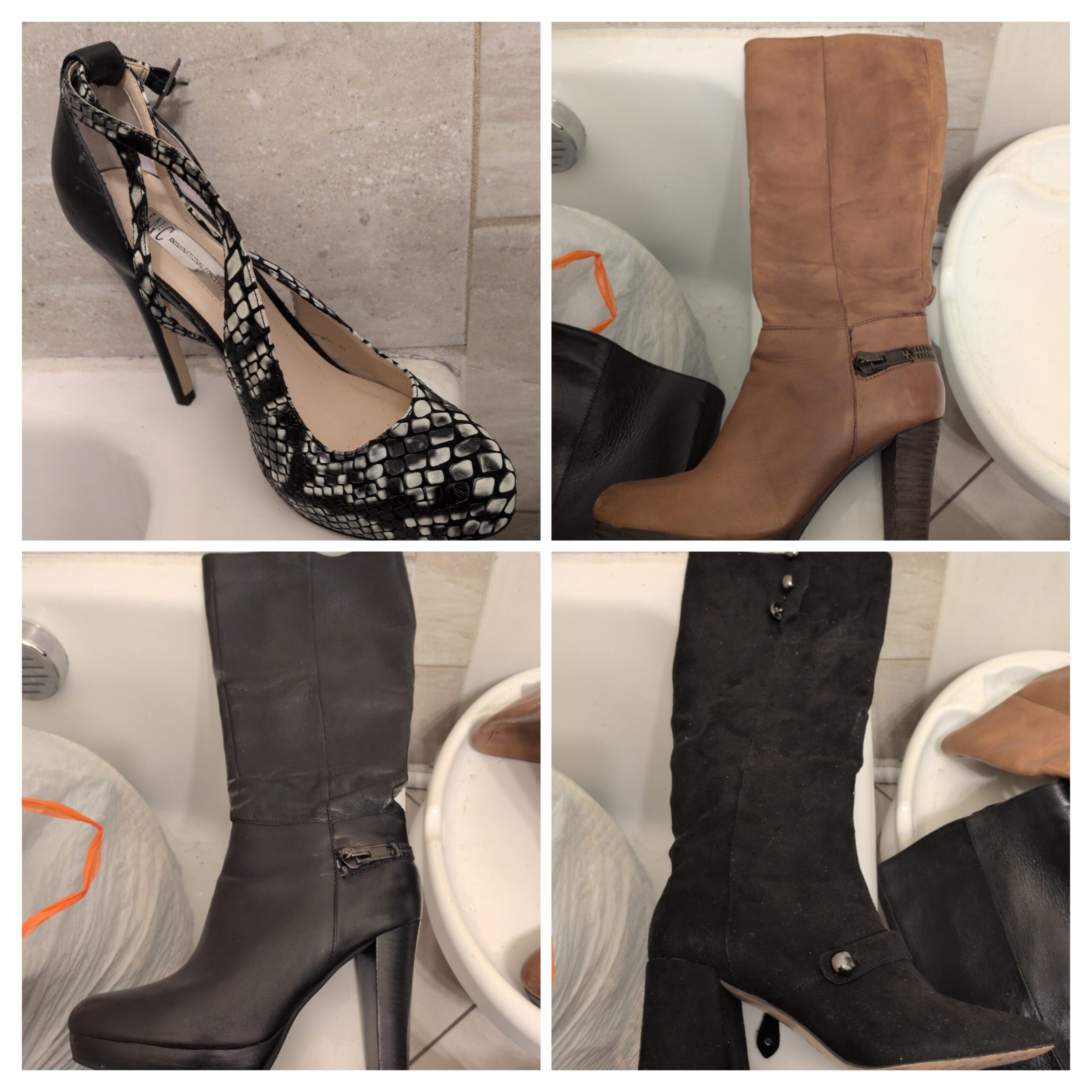 The shoes and boots with buttons are size 7 the other 2 boots are 7.5. All in very good condition. All free