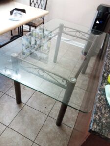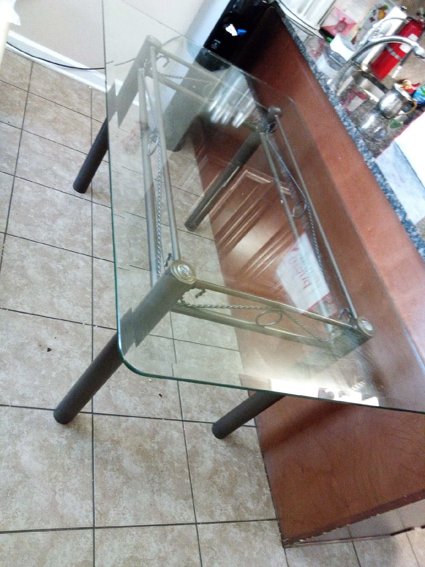 Used but good condition table. Bronze metal base with glass top. Glass is quite scratched but looks decent fully functional.