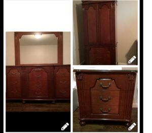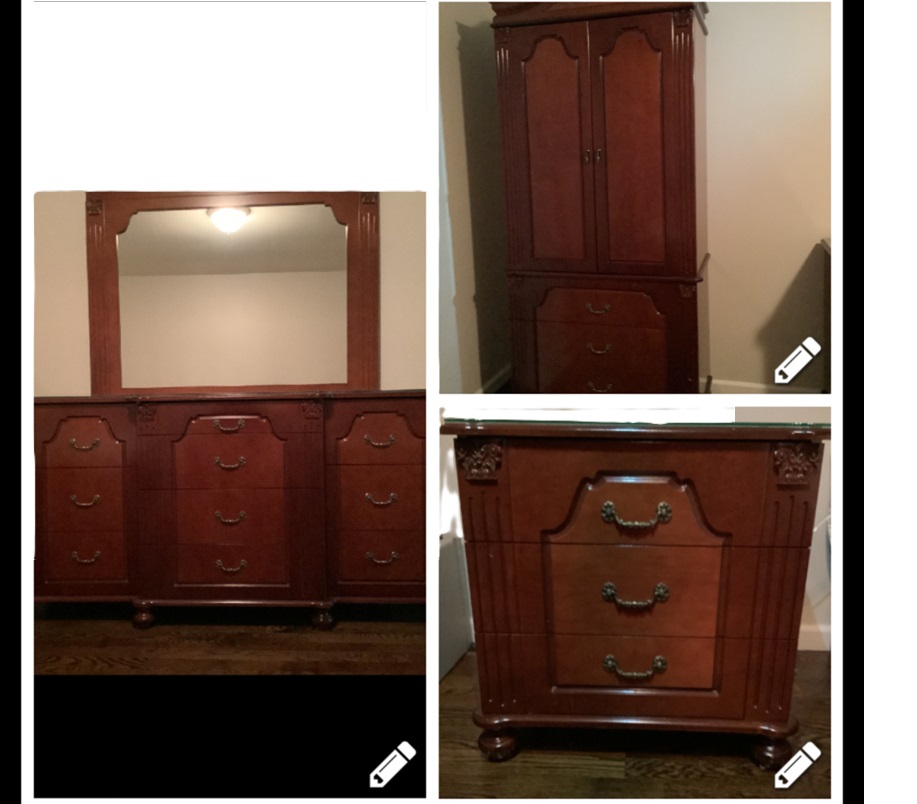 D&W Master bedroom set. This set includes two 39” beds with headboards. a magnificent dresser with a mirror and a glass top. a spacious armoire, and 2 nightstands with glass tops.