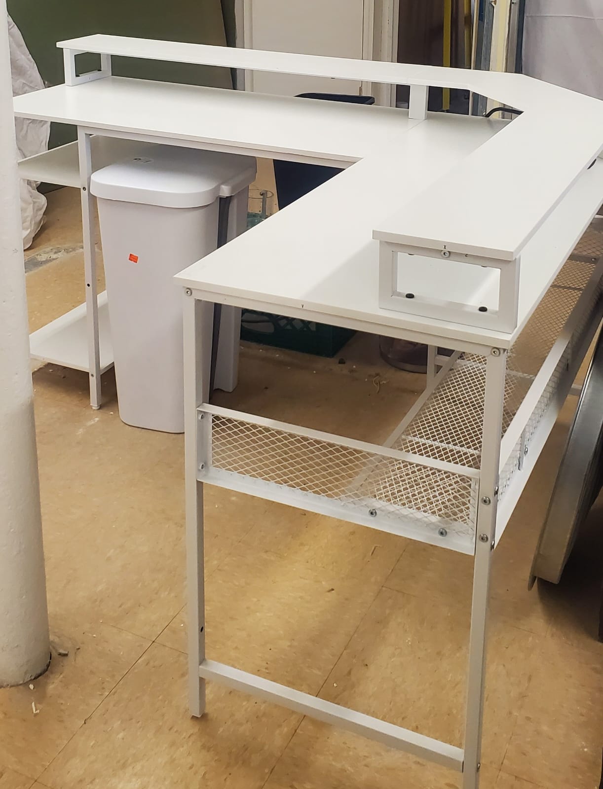 White, corner desk, has outlet attachments.